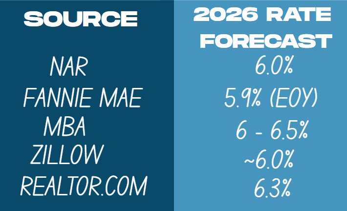 Forecasters agree broadly on mortgage rate trajectories. Expectations cluster tightly in the 6.0% to 6.4% range, representing modest but meaningful improvement from 2025 levels.